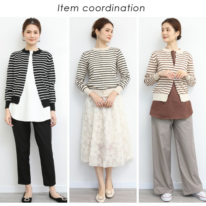 ----------------------- [関連ワード]カーディガン ボーダー 長袖 レディース ニット トップス 羽織り ラウンドネック 丸首 ニットカーデ シンプル オフィス ボーダー柄 黒 ブラック ベージュ ブラウン 秋冬 春 【 ボーダーニットカーディガン 】【春 新作】【2021年2月新作】