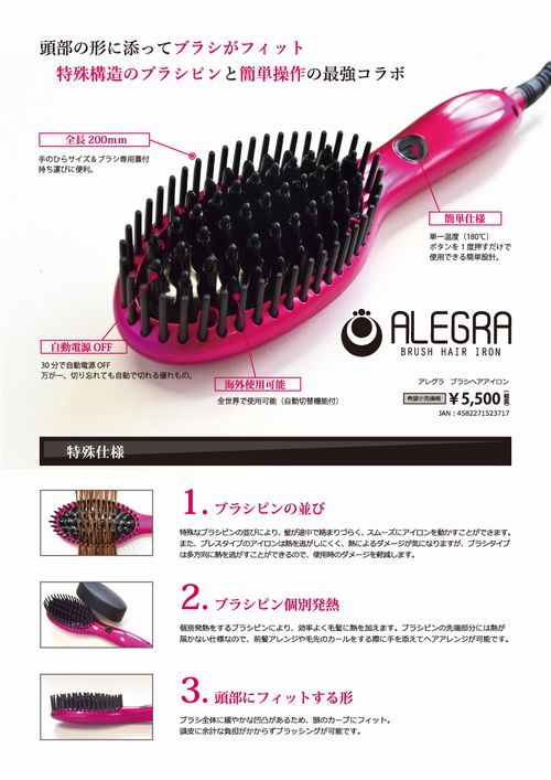 アレグラ ミニブラシ ヘアアイロン TF-3916アレグラブラシ型アイロンに新商品が登場!よりコンパクトになり、持ち手も細く握りやすい【新商品のポイント】◆ブラシピンの並びブラシピンの特殊な並び方により、髪の途中で絡まることがなくスムーズにアイロンを動かすことが可能。